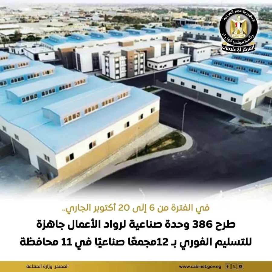 في إطار توجيهات القيادة السياسية بدعم قطاع الصناعة وتعميق التصنيع المحلي ودعم المشروعات الصغيرة ومتناهية الصغر، أعلنت وزارة الصناعة عن طرح 386 وحدة صناعية شاغرة جاهزة للتسليم وكاملة المرافق والخدمات لرواد الأعمال الجادين داخل 12 مجمعًا صناعيًا بـ 11 محافظة، وذلك عبر منصة مصر الصناعية الرقمية خلال الفترة من 6 وحتى 20 أكتوبر الجاري.