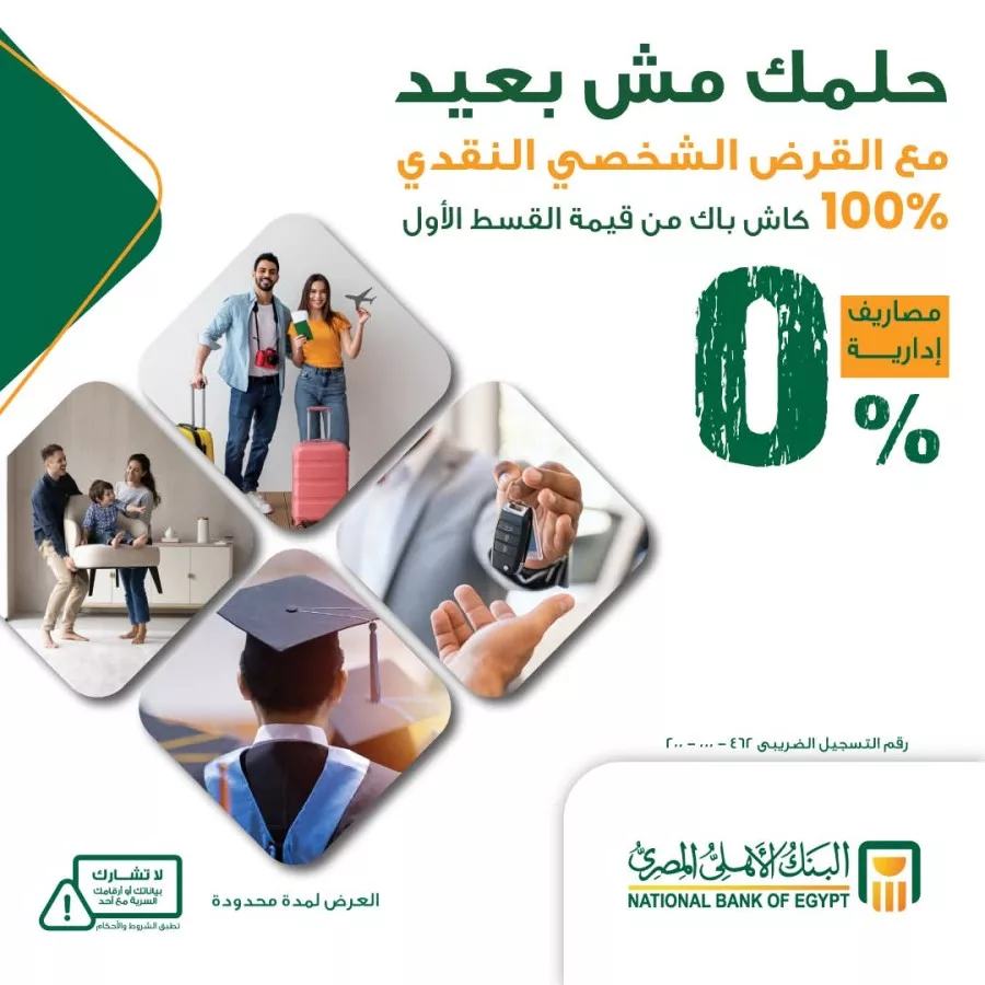 حقق حلمك ..دلوقتي تقدر تحصل على قرض شخصي بدون أى مصاريف إدارية،بالإضافة إلى استرداد قيمة القسط الأول” 100% كاش باك”.