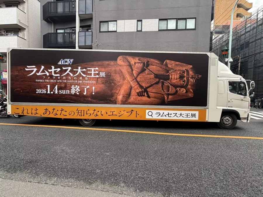 وتتميز الشاحنة بتصميم بصري جذاب يحمل صورة ضخمة للملك رمسيس الثاني، إلى جانب الهوية البصرية الرسمية للمعرض ومواعيد انتهائه، مما يجذب انتباه المارة ويُبرز الطابع الحضاري والأثري الفريد للمعرض. كما تتيح هذه الشاحنة، وهي إحدى أكثر وسائل الإعلان انتشاراً في اليابان، تحقيق وصول واسع للجمهور الياباني في الأحياء التجارية والترفيهية ذات الكثافة العالية.