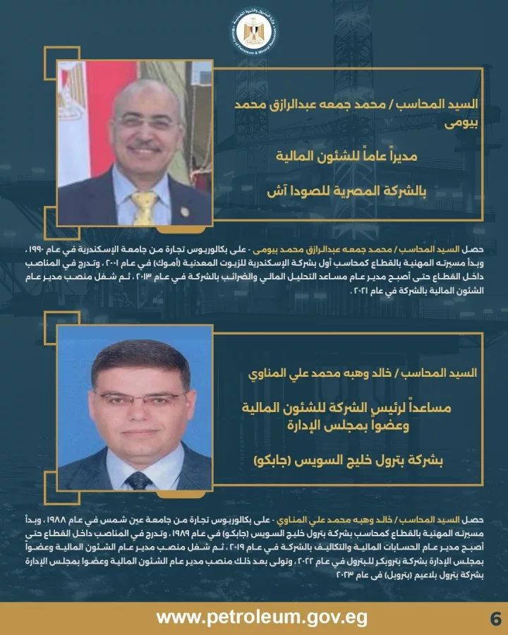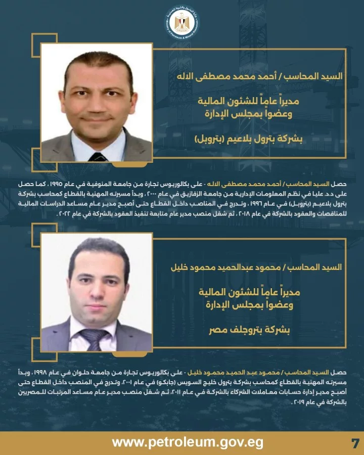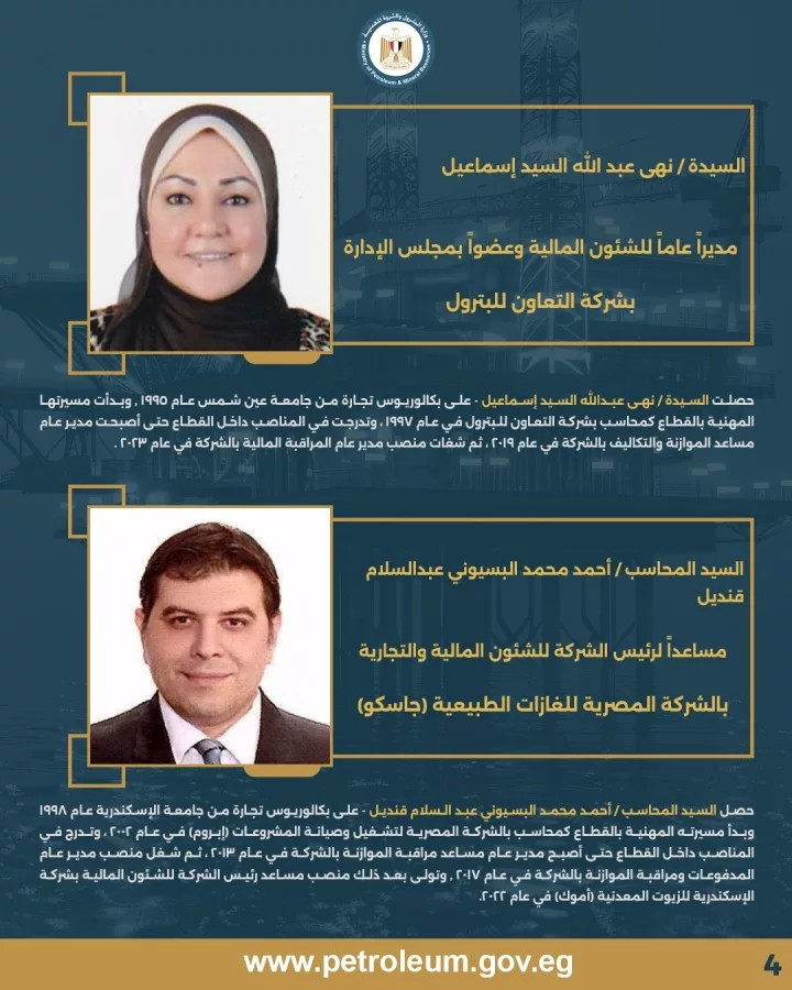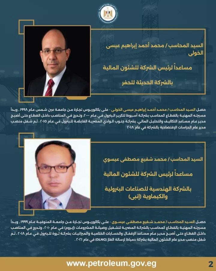 في إطار العمل على تطوير الأداء وضخ دماء جديدة في مواقع القيادة، أصدر المهندس كريم بدوي وزير البترول والثروة المعدنية حركة تنقلات بين قيادات الشئون المالية، شملت تعيين نائب للعضو المنتدب التنفيذي للشركة المصرية القابضة للغازات الطبيعية “إيجاس” للشئون المالية، إلى جانب تكليف مساعدي رؤساء الشركات ومديري عموم الشئون المالية في عدد من شركات قطاع البترول.