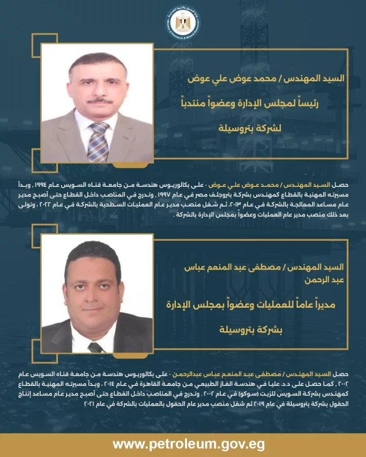 المهندس كريم بدوي يُكلف المهندس محمد عوض برئاسة شركة بتروسيلة والمهندس مصطفى عبدالمنعم مديراً عاماً للعمليات