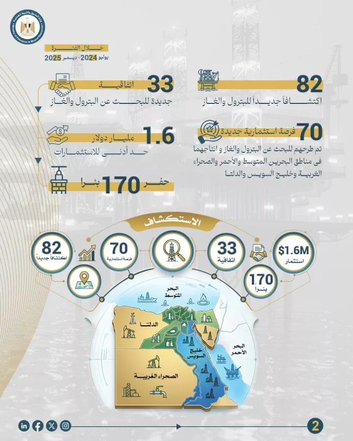 تم توقيع 33 اتفاقية جديدة للبحث عن البترول والغاز وانتاجهما باستثمارات حدها الأدنى يزيد عن 1.6 مليار دولار وحفر أكثر من 170 بئرًا جديدة.