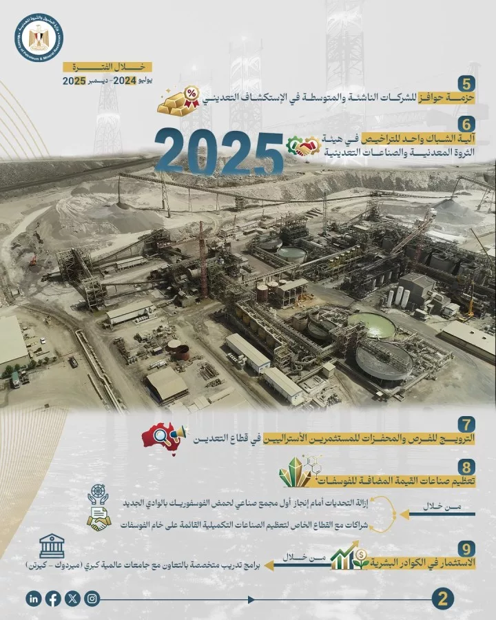 الانتهاء من مراحل العمل على إطلاق البوابة الرقمية للفرص الاستثمارية في التعدين والمقرر اطلاقها رسمياً خلال النصف الأول من عام 2026، لتكون منصة موحدة تمكن المستثمر من الاطلاع على الفرص وتنفيذ جميع إجراءات التقدم والتعاقد من خلالها.