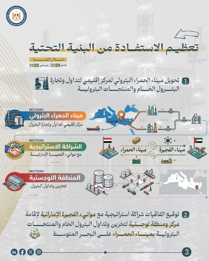 توقيع اتفاقيات تطوير ميناء الحمراء البترولي بالعلمين الجديدة وتحويله لمركز إقليمي علي ساحل البحر المتوسط لتخزين وتداول وتجارة البترول الخام والمنتجات البترولية، وذلك بالتعاون مع موانئ الفجيرة الإماراتية التي تعد ثاني أكبر مركز عالميا في هذا المجال .