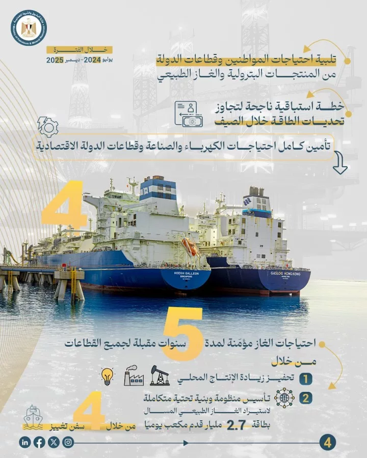 عودة مصر إلى تصدير عدد من شحنات الغاز الطبيعي المسال في عام 2025 وذلك لتحقيق قيمة مضافة ومردود اقتصادي متمثل في تعظيم الاستفادة الاقتصادية من مجمعات الغاز المسال والدور المصري كمركز إقليمي لتداول وتجارة الغاز فضلاً عن تحفيز الشركاء الأجانب على ضخ الاستثمار اللازم لزيادة انتاج الغاز.