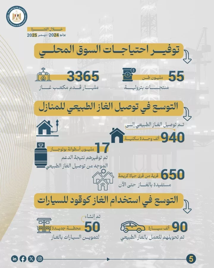 توفير 55 مليون طن من المنتجات البترولية للاستهلاك المحلى و 3356 مليار قدم مكعب غاز ، كمالتم توصيل الغاز الطبيعى الى 940 الف وحدة سكنية مما ساهم في توفير 17 مليون اسطوانة بوتاجاز والدعم الموجه لها ، وبلغ عدد قرى حياة كريمة المستفيدة بالغاز الطبيعى اكثر من 650 قرية حتى الآن ، كما تم تحويل 90 الف سيارة للعمل بالغاز الطبيعى وانشاء نحو 50 محطة جديدة لتموين السيارات بالغاز.