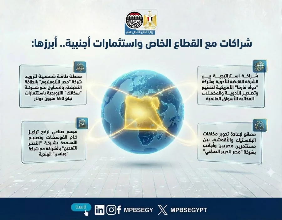 وفي سياق دعم الاستدامة وتعزيز الشراكات، تم إطلاق عدة شراكات استراتيجية مع القطاع الخاص واستثمارات أجنبية، من بينها مشروع إنشاء محطة طاقة شمسية لمجمع “مصر للألومنيوم” بالتعاون مع شركة “سكاتك” النرويجية باستثمارات 650 مليون دولار، وشراكة بين القابضة للأدوية وشركة دواه فارما الأمريكية لتصنيع وتصدير الأدوية والمكملات الغذائية إلى الأسواق العالمية، إلى جانب مشروع مجمع صناعي للفوسفات وتصنيع الأسمدة بشركة النصر للتعدين مع “ويلسن” الهندية، ومشروع إقامة مصانع لإعادة تدوير مخلفات البلاستيك والأقمشة بشركة مصر للحرير الصناعي بالتعاون مع مستثمرين مصريين وأجانب، بما يعكس توجه الدولة نحو تعظيم الاستفادة من الأصول وتحقيق نمو مستدام.