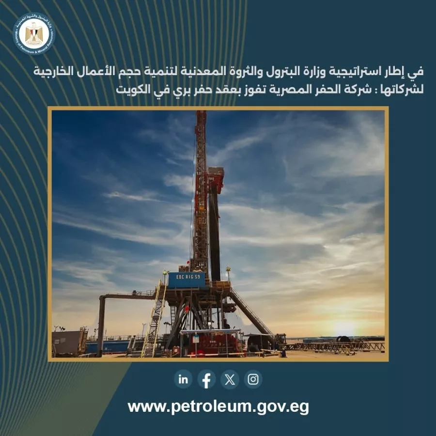 في إطار استراتيجية وزارة البترول والثروة المعدنية لتعزيز تواجد شركات المشروعات والحفر المصرية بالأسواق الخارجية، فازت شركة الحفر المصرية EDC مؤخراً بعقد جديد في دولة الكويت لتشغيل جهاز حفر بقدرة 1500 حصان للعمل مع شركة نفط الكويت KOC، ليعد هذا الفوز الأول من نوعه لشركة مصرية في مجال الحفر مع نفط الكويت .