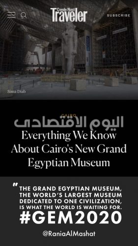 نشرت مجلة كوندي ناست ترافلر Conde Nast Traveller السياحية الأمريكية مقالا تفصيليا عن المتحف المصرى الكبير تحت عنوان “كل ما نعرفه عن المتحف المصرى الكبير”، تضمن الحديث عن موقع المتحف وتصميمه الداخلى وكيفية الوصول إليه.