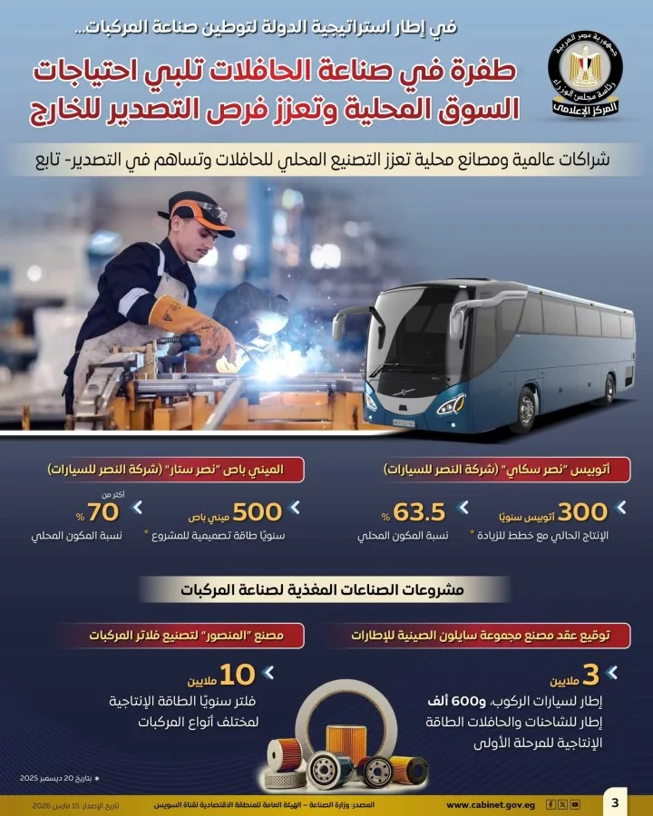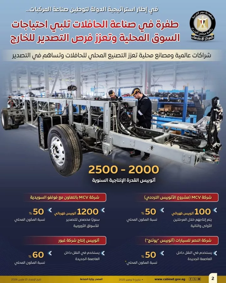 نشر المركز الإعلامي لمجلس الوزراء عددًا من الإنفوجرافات عبر منصاته الرسمية على مواقع التواصل الاجتماعي، سلطت الضوء على ما شهدته صناعة الحافلات من طفرة أسهمت في تلبية احتياجات السوق المحلي، والانطلاق بقوة نحو التصدير، وذلك في إطار استراتيجية الدولة لتوطين صناعة المركبات وتعميق التصنيع المحلي.