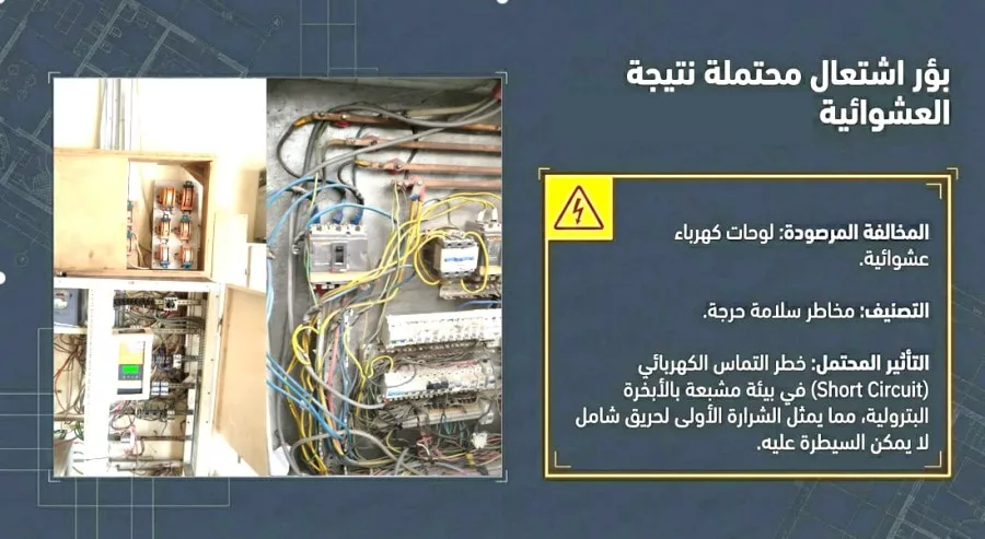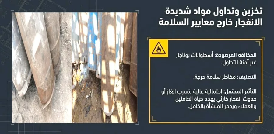 وفي أحد مستودعات الجنوب، تم ضبط تحميل سيارات بكميات تزيد على المثبت بفواتير الشحن، حيث جرى تفريغ الكميات الزائدة وإعادتها إلى المستودع، كما تم رصد مخالفات تتعلق بعدم استيفاء اشتراطات التشغيل الآمن ونقص وسائل الإطفاء.
