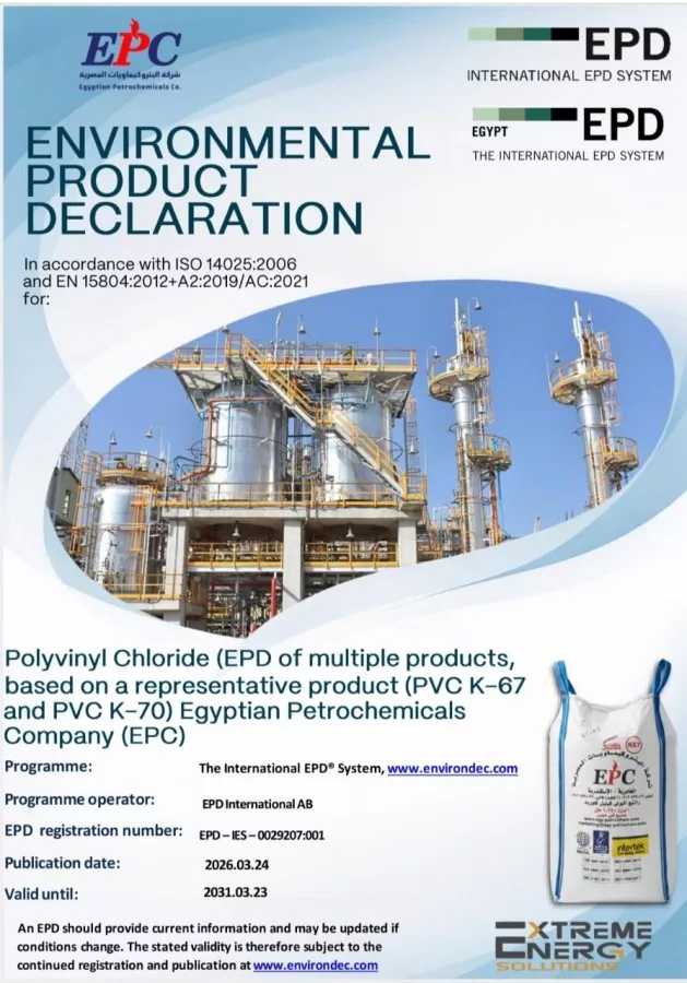 نجاح غير مسبوق لشركة البتروكيماويات المصرية بقيادة الكيميائي أحمد موقع ، رئيس مجلس الإدارة – أضافت الشركة إنجازًا جديدًا يُضاف إلى سلسلة إنجازاتها، وذلك من خلال الحصول على التحقق الدولي لتقارير الإفصاح البيئي (EPD) لمنتجاتها من مادة PVC بدرجاته K67 / K70، ومادة الصودا الكاوية (Caustic Soda)، مع التنسيق لنشر هذه التقارير عالميًا، بالتعاون مع شركة «إكستريم إنيرچي جروب».