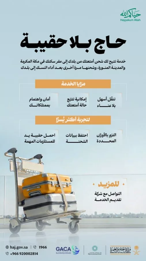 وتتطلب الخدمة الجديدة التزام الحجاج بالإرشادات المنظمة للخدمة، خاصة ما يتعلق بالأوزان المحددة للأمتعة، والاحتفاظ ببيانات الشحن، والاكتفاء بحقيبة يد تحتوي على المستلزمات الأساسية خلال الرحلة.