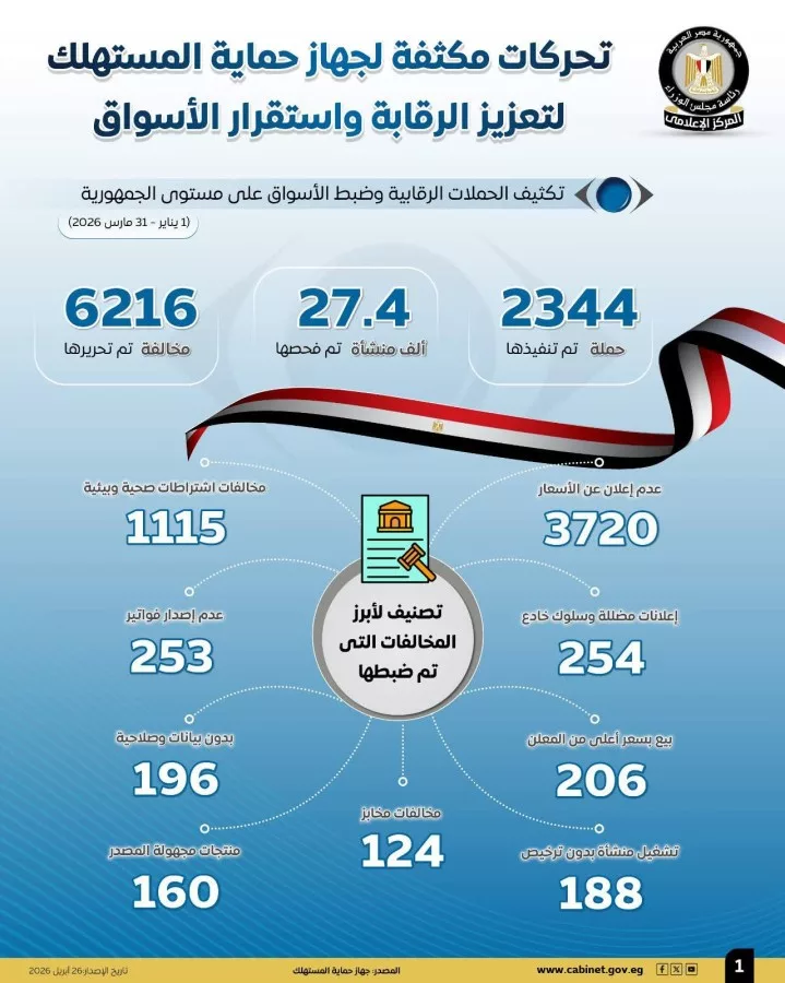 وسلطت الإنفوجرافات الضوء على الحملات الرقابية المكثفة لضبط الأسواق على مستوى الجمهورية، وذلك خلال الفترة من 1 يناير حتى 31 مارس 2026، حيث تم تنفيذ 2344 حملة، وكذلك فحص 27.4 ألف منشأة، وقد أسفرت الحملات عن تحرير 6216 مخالفة.