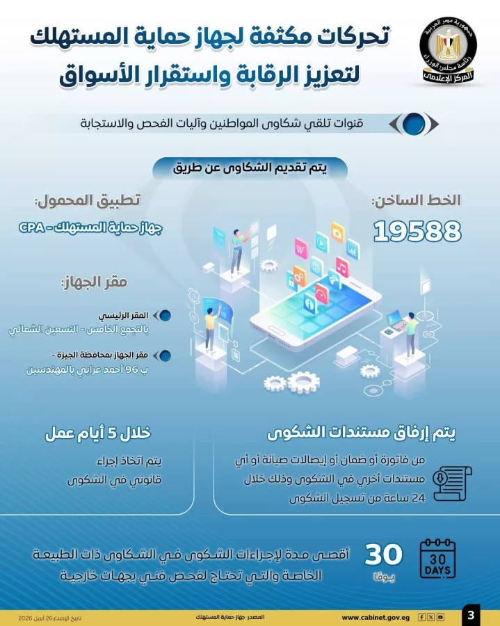 وأشارت الإنفوجرافات إلى قنوات تلقي شكاوى المواطنين وآليات الفحص والاستجابة، إذ يتم تقديم الشكاوى عبر الخط الساخن 19588، أو عبر تطبيق “جهاز حماية المستهلك – CPA” على الهاتف المحمول، أو من خلال المقر الرئيسي للجهاز بالتجمع الخامس – التسعين الشمالي، وكذلك مقره بمحافظة الجيزة في ب 96 شارع أحمد عرابي – المهندسين.
