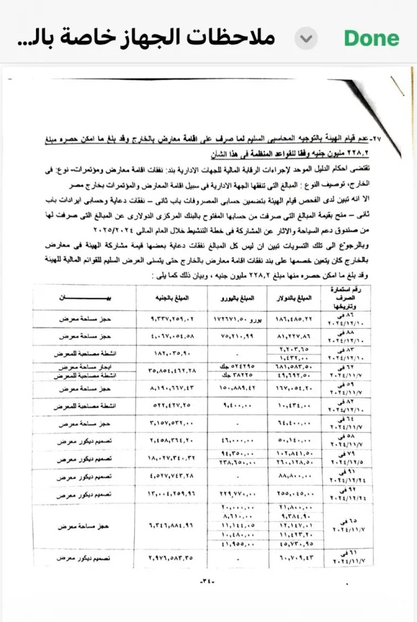 وفى تقرير للجهاز عن العام المالي السابق ٢٠٢٤ / ٢٠٢٥ ، أكد الجهاز على عدم قيام الهيئة بالتوجيه المحاسبي السليم لما صرف على إقامة المعارض الخارجية التى تم تنفيذها ، وقد بلغ ما أمكن حصره مبلغ ٢٢٨،٢ مليون جنيه وفقًا للقواعد المنظمة فى هذا الشأن، وبما يوازيه بالعملة الأجنبية التى تدفع بالدولار و اليورو.