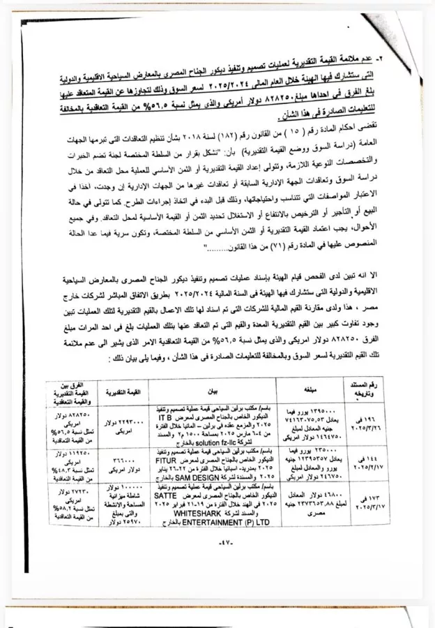 وأشار الجهاز إلى عدم ملائمة القيمة التقديرية لعمليات تصميم وتنفيذ ديكور الجناح المصرى بالمعارض السياحية الإقليمية والدولية التى تشارك فيها الهيئة المصرية العامة للتنشيط السياحي لسعر السوق ، وذلك لتجاوزها عن القيمةالمتعاقد عليها بلغ الفرق في أحدها ، مبلغ ٨٢٨٢٥٠ دولار أمريكي، والذى يمثل نسبة ٥٦،٥٪ من القيمة التقديرية بالمخالفة للتعليمات الصادرة فى هذا الشأن.