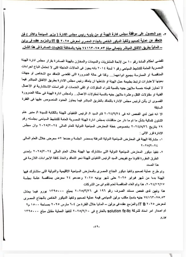 أكد الجهاز على عدم الحصول على موافقة مجلس إدارة الهيئة المصرية العامة للتنشيط السياحي أو من ينوبه رئيس مجلس إدارة الهيئة ” وزير السياحة والآثار ” قبل التعاقد عن عملية تصميم وتنفيذ الديكور الخاص بالجناح المصرى لمعرض ITB برلين ٢٠٢٥ بطريق الإتفاق المباشر بإجمالي مبلغ ٧٤،٢ مليون جنيه بالمخالفة للتعليمات الصادرة فى هذا الشأن، حيث تبين لدى فحص مستند الصرف رقم ١٩٦ فى ٢٠٢٥/٣/٢٦ بمبلغ ١٣٩٥٠٠٠ يوروا فيما يعادل المبلغ المذكور سلفا ، باسم مكتب برلين السياحى .