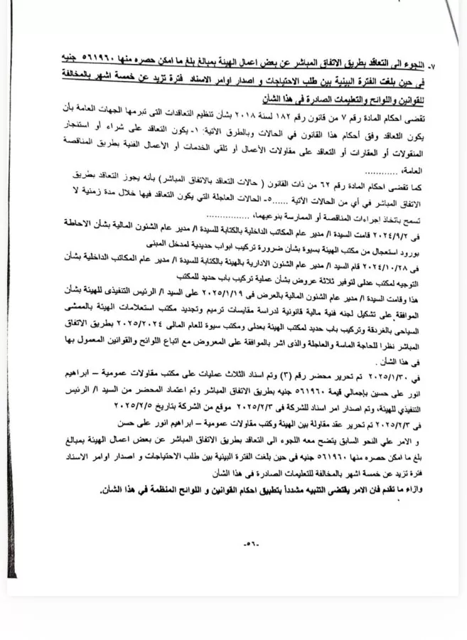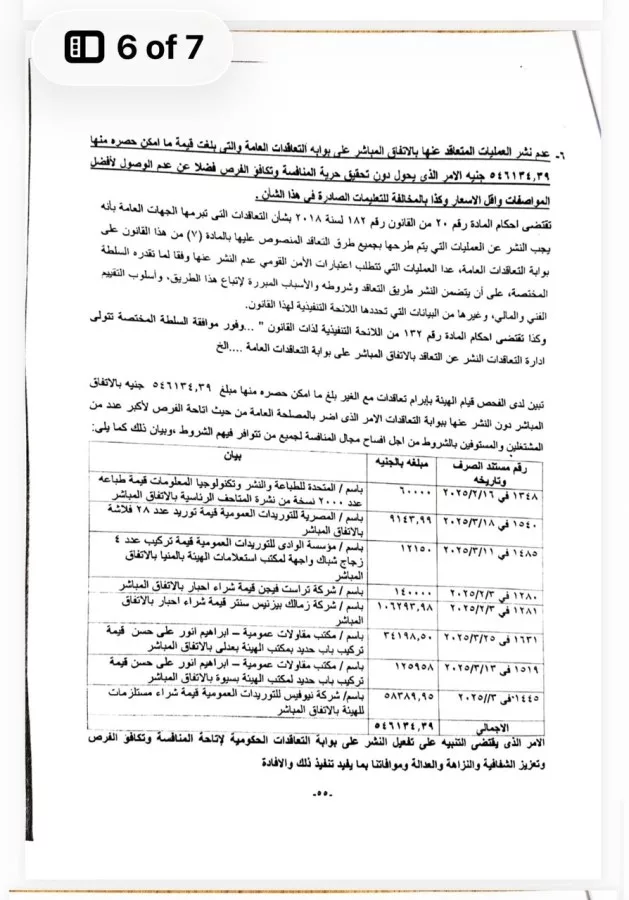 كشف الجهاز عن عدم نشر العمليات المتعاقد عنها بالاتفاق المباشر على بوابة التعاقدات العامة ، والتى بلغت قيمة ما أمكن حصره منها ٥٤٦١٣٤،٤ جنيه، الأمر الذي يحول دون تحقيق حرية المنافسة وتكافؤ الفرص ، فضلًا عن عدم الوصول لأفضل المواصفات وأقل الأسعار، وكذا بالمخالفة للتعليمات الصادرة فى هذا الشأن.