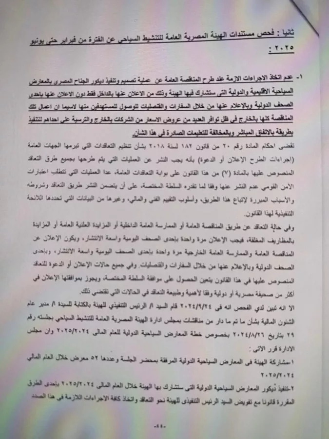 وأشار الجهاز إلى عدم اتخاذ الإجراءات اللازمة عند طرح المناقصة العامة عن عمليات تصميم وتنفيذ ديكور الجناح المصرى بالمعارض السياحية الإقليمية والدولية التى تشارك فيها الهيئة، وذلك من الإعلان عنها بالداخل فقط دون الإعلان عنها بإحدى الصحف الدولية وبالإعلام عنها من خلال السفارات والقنصليات للوصول للمستهدفين منها ، لاسيما أن أعمال تلك المناقصة كلها بالخارج فى ظل توافر العديد من عروض الأسعار من الشركات بالخارج والترسية على أحداهم للتنفيذ بطريقة بالإتفاق المباشر و بالمخالفة للتعليمات الصادرة فى هذا الشأن.