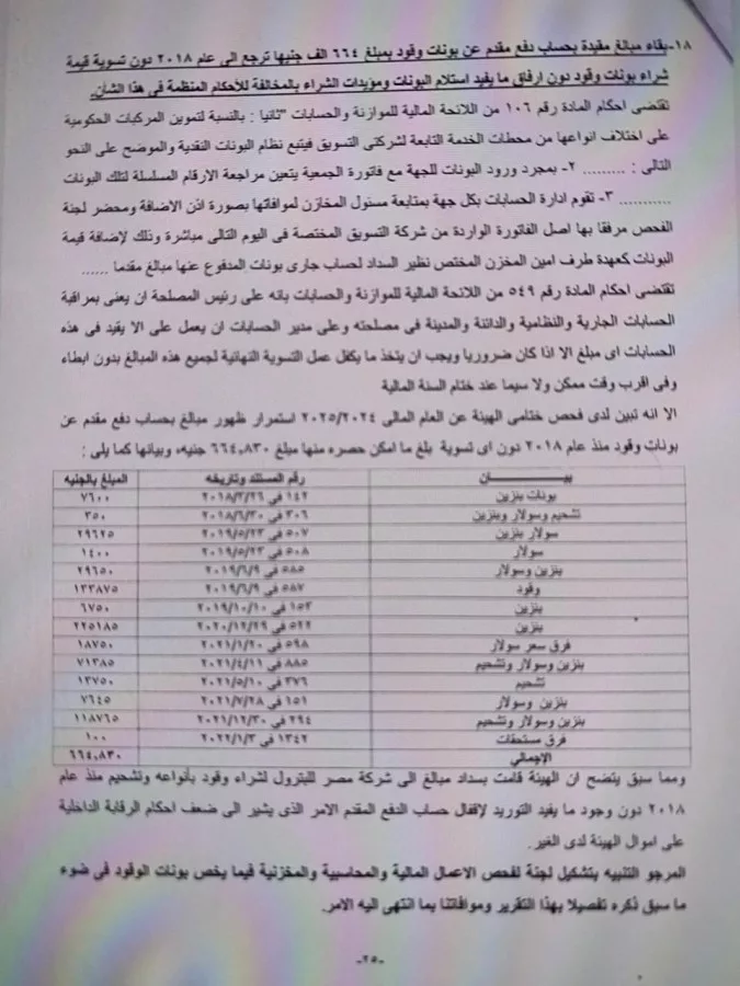 أشار الجهاز إلى بقاء مبالغ مقيدة بحساب دفع مقدم بونات وقود بمبلغ ٦٦٤ ألف جنيه، ترجع إلى عام ٢٠١٨ دون تسوية قيمة شراء بونات وقود دون إرفاق ما يفيد استلام البونات ومؤيدات الشراء بالمخالفة للأحكام المنظمة فى هذا الشأن.