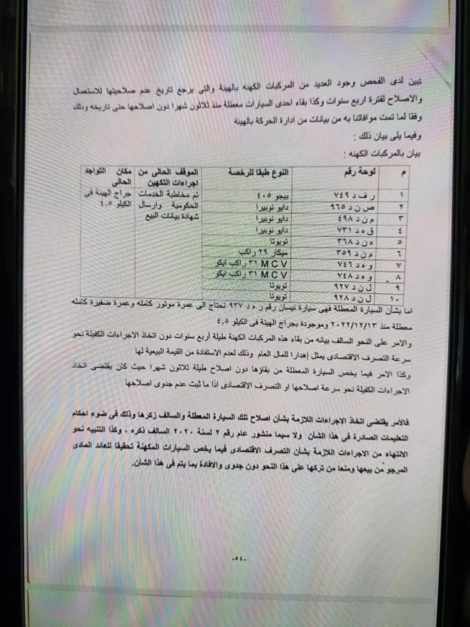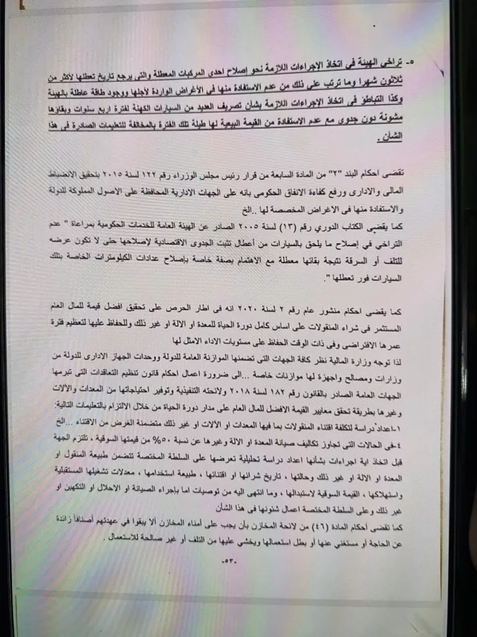 أكد التقرير على تراخى الهيئة فى اتخاذ الإجراءات اللازمة نحو إصلاح المركبات المعطلة والتى يرجع تاريخ تعطلها لأكثر من ثلاثون شهرًا وما ترتب على ذلك من عدم الاستفادة منها فى الأغراض الواردة لأجلها ، ووجود طاقة عاطلة بالهيئة، وكذا التباطؤ فى اتخاذ الإجراءات اللازمة بشأن تصريف العديد من السيارات المهنة لفترة أربع سنوات وبقاؤها مشونة دون جدوى مع عدم الاستفادة من القيمة البيعية لها طيلة تلك الفترة بالمخالفة للتعليمات الصادرة فى هذا الشأن.