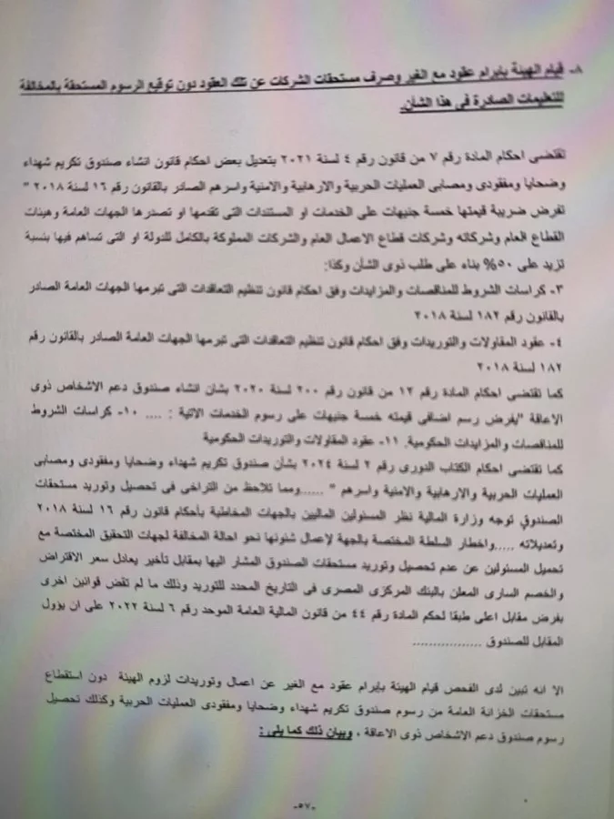 أشار الجهاز فى تقريره إلى قيام الهيئة بابرام عقود مع الغير و صرف مستحقات الشركات عن تلك العقود دون توقيع الرسوم المستحقة بالمخالفة للتعليمات الصادرة فى هذا الشأن.