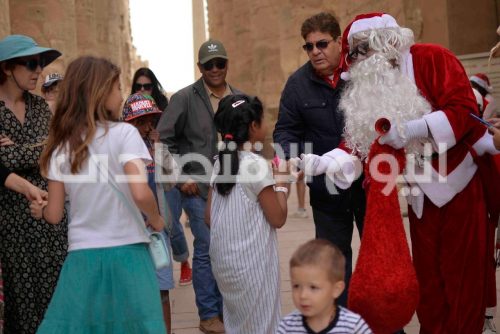 ووزع شابا وطفل ارتديا زى بابا نويل المميز ورود ،وقطع الباستر وتماثيل مقلدة وجعارين فرعونية على السائحين وعلى زوار المعبد وسط سعادة كبيرة من السائحين الذين التقطوا صورا تذكارية مع بابا نويل ومع منسقي ومنظمى الفعاليات فى حضور الدكتور مصطفى الصغير مدير عام أثار الكرنك وعدد من قيادات منطقة أثار الأقصر.