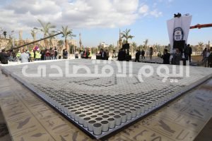 و علي أنغام الهارب قام مجموعة من شباب المصريين خلال الفاعلية بتنفيذ تصميم قناع الملك توت عنخ آمون على مساحة 60 متر مربع، وذلك بالساحة المؤدية إلى منطقة المطاعم المفتوحة بالمتحف المصرى الكبير فى أجواء من الحماس والبهجة.