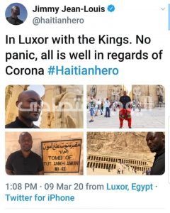 وحرص جيمي لويس على التقاط العديد من الصور التذكارية اثناء زياراته لمعالم الاقصر الأثرية و السياحية، و نشرها في عدة تويتات عبر حسابه على موقع التواصل الاجتماعي تويتر داعيا العالم بالمجئ الي مصر و الاستمتاع بحضارتها العريقة و جوها الدافئ و شمسها المشرقة قائلا “انا في الاقصر مع الملوك العظماء…لا داعي للذعر بخصوص كورونا، كل شئ جميل و جيد.”