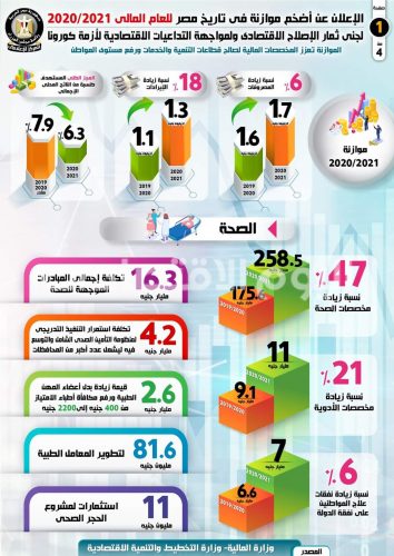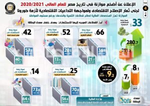وقد نشر المركز الإعلامي لمجلس الوزراء، إنفوجرافاً سلط من خلاله الضوء على المخصصات المالية لصالح قطاعات التنمية والخدمات ورفع مستوى المواطن، وذلك بعد الإعلان عن أضخم موازنة في تاريخ مصر للعام المالي 2020/2021، لجني ثمار الإصلاح الاقتصادي ولمواجهة التداعيات الاقتصادية لأزمة كورونا.