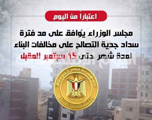 اعتباراً من اليوم: مجلس الوزراء يُوافق على مد فترة سداد جدية التصالح على مخالفات البناء لمدة شهر حتى 15 سبتمبر المقبل