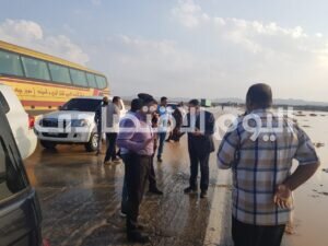 وجه المحافظ أيضاً بتوفير أوناش لرفع الأتوبيسات والسيارات التي انحرفت عن الطريق، وإلتقى عدداً من المواطنين العالقين على الطريق، واطمأن عليهم، رافضاً مغادرة الطريق حتى انقاذ وتوصيل آخر مواطن إلى وجهته، حيث شاركت الشركة العامة للبترول بمعداتها.