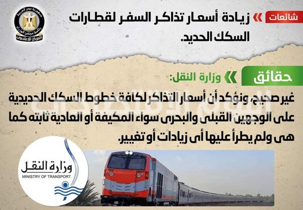 تداولت بعض المواقع الإلكترونية وصفحات التواصل الاجتماعي أنباء عن زيادة أسعار تذاكر السفر لقطارات السكك الحديد، وقد قام المركز الإعلامي لمجلس الوزراء بالتواصل مع وزارة النقل، والتي نفت تلك الأنباء تماماً، مُؤكدةً أنه لا صحة لزيادة أسعار تذاكر السفر لقطارات السكك الحديد، وأن أسعار التذاكر لكافة خطوط السكك الحديدية على الوجهين القبلي والبحري سواء المكيفة أو العادية ثابته كما هي ولم يطرأ عليها أي زيادات أو تغيير.