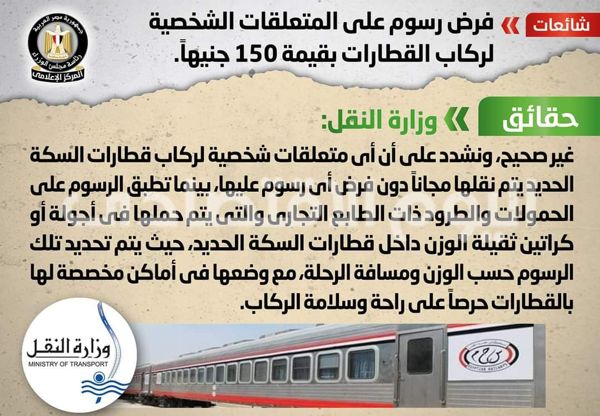 انتشر في بعض المواقع الإلكترونية وصفحات التواصل الاجتماعي أنباء بشأن فرض رسوم على المتعلقات الشخصية لركاب القطارات بقيمة 150 جنيهاً، وقد قام المركز الإعلامي لمجلس الوزراء بالتواصل مع وزارة النقل، والتي نفت تلك الأنباء، مُؤكدةً أنه لا صحة لفرض رسوم على المتعلقات الشخصية لركاب القطارات بقيمة 150 جنيهاً، مُشددةً على أن أي متعلقات شخصية لركاب قطارات السكة الحديد يتم نقلها مجاناً دون فرض أي رسوم عليها، بينما تطبق الرسوم على الحمولات والطرود ذات الطابع التجاري والتي يتم حملها في أجولة أو كراتين ثقيلة الوزن داخل قطارات السكة الحديد، حيث يتم تحديد تلك الرسوم حسب الوزن ومسافة الرحلة، مع وضعها في أماكن مخصصة لها بالقطارات حرصاً على راحة وسلامة الركاب.