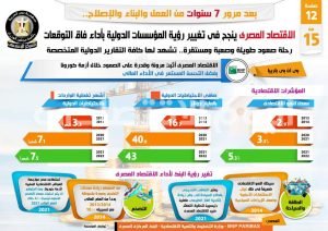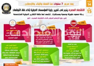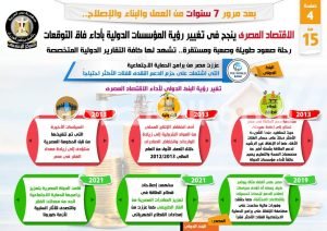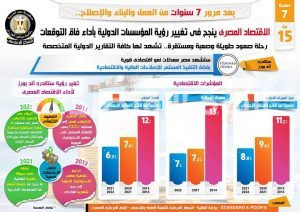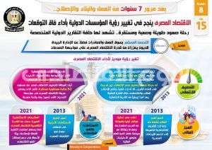 وفي هذا الصدد نشر المركز الإعلامي لمجلس الوزراء تقريراً تضمن إنفو جرافات تسلط الضوء على نجاح الاقتصاد المصري في تغيير رؤية المؤسسات الدولية بأداء فاق التوقعات، فضلاً عن استعراض رحلته للصعود التي شهدت لها كافة التقارير الدولية المتخصصة، وذلك بعد مرور 7 سنوات من العمل والبناء والإصلاح.
