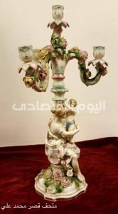 يعرض شمعدان مصنوع من البورسلين الأبيض ذو قاعدة دائرية يليه بدن على شكل امرأة تحمل طفلا ممسكا بيده عمود ينتهي بأربعة أذرع محلاة بزخارف نباتية و وريدات تنتهي بأربعة تجاويف لوضع الشمع.