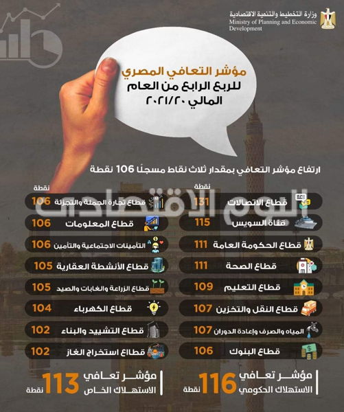تلقت الدكتورة هالة السعيد، وزيرة التخطيط والتنمية الاقتصادية تقريرًا من وحدة الاقتصاد الكلي بالوزراة حول مؤشر التعافي المصري للربع الرابع من العام المالي 20/2021، حيث أشار التقرير إلى ارتفاع المؤشر بمقدار ثلاث نقاط مسجلًا 106 نقطة مرتفعًا من 103 نقطة في الربع السابق في ذات العام، وهو ما يشير إلى استمرار تعافي الاقتصاد المصري.