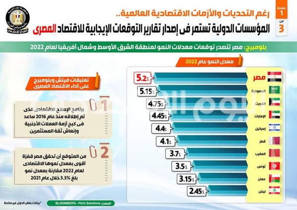 وكشف التقرير عن توقعات بلومبرج بتصدر مصر معدلات النمو لمنطقة الشرق الأوسط وشمال إفريقيا عام 2022، وذلك بمعدل 5.2%، فيما توقعت أن تحقق مصر قفزة أقوى بمعدل نموها الاقتصادي لعام 2022 مقارنة بمعدل نمو بلغ 3,3% خلال عام 2021.