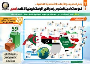 وفي هذا الصدد نشر المركز الإعلامي لمجلس الوزراء تقريراً تضمن إنفوجرافات تسلط الضوء على استمرار التوقعات الإيجابية للمؤسسات الدولية بشأن الاقتصاد المصري، وذلك رغم استمرار التحديات والأزمات الاقتصادية العالمية.