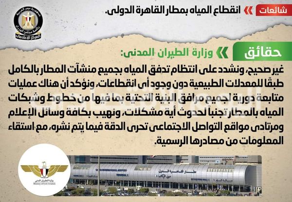 انتشر في بعض المواقع الإلكترونية وصفحات التواصل الاجتماعي أنباء بشأن انقطاع المياه بمطار القاهرة الدولي، وقد قام المركز الإعلامي لمجلس الوزراء بالتواصل مع وزارة الطيران المدني، والتي نفت تلك الأنباء، مُؤكدةً أنه لا صحة لانقطاع المياه بمطار القاهرة الدولي، مُشددةً على انتظام تدفق المياه بجميع منشآت المطار بالكامل طبقًا للمعدلات الطبيعية، دون وجود أي انقطاعات، مُؤكدةً أن هناك عمليات متابعة دورية لجميع مرافق البنية التحتية بما فيها من خطوط وشبكات المياه بالمطار تجنباً لحدوث أية مشكلات، مُهيبةً بكافة وسائل الإعلام ومرتادي مواقع التواصل الاجتماعي تحري الدقة فيما يتم نشره، مع استقاء المعلومات من مصادرها الرسمية.