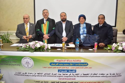 وجاء عنوان الرسالة ” دراسة مقارنة عن استخدام المختبرات الطبيعية والتجارية في معالجة مياه الصرف الصناعي الناتجة من وحدات تكرير البترول”.