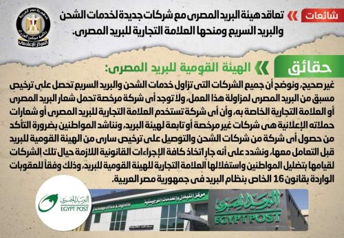تداولت بعض المواقع الإلكترونية وصفحات التواصل الاجتماعي أنباء بشأن تعاقد هيئة البريد المصري مع شركات جديدة لخدمات الشحن والبريد السريع ومنحها العلامة التجارية للبريد المصري، وقد قام المركز الإعلامي لمجلس الوزراء بالتواصل مع الهيئة القومية للبريد المصري، والتي نفت تلك الأنباء، مُؤكدةً أنه لا صحة لتعاقد هيئة البريد المصري مع شركات جديدة لخدمات الشحن والبريد السريع ومنحها العلامة التجارية للبريد المصري، مُوضحةً أن جميع الشركات التي تزاول خدمات الشحن والبريد السريع تحصل على ترخيص مسبق من البريد المصري لمزاولة هذا العمل، ولا توجد أي شركة مرخصة تحمل شعار البريد المصري أو العلامة التجارية الخاصة به، وأن أي شركة تستخدم العلامة التجارية للبريد المصري أو شعارات حملاته الإعلانية هي شركات غير مرخصة أو تابعة لهيئة البريد، مُناشدةً المواطنين بضرورة التأكد من حصول أي شركة من شركات الشحن والتوصيل على ترخيص ساري من الهيئة القومية للبريد قبل التعامل معها، مُشددةً على أنه جارٍ اتخاذ كافة الإجراءات القانونية اللازمة حيال تلك الشركات لقيامها بتضليل المواطنين واستغلالها العلامة التجارية للهيئة القومية للبريد، وذلك وفقاً للعقوبات الواردة بقانون 16 الخاص بنظام البريد في جمهورية مصر العربية.