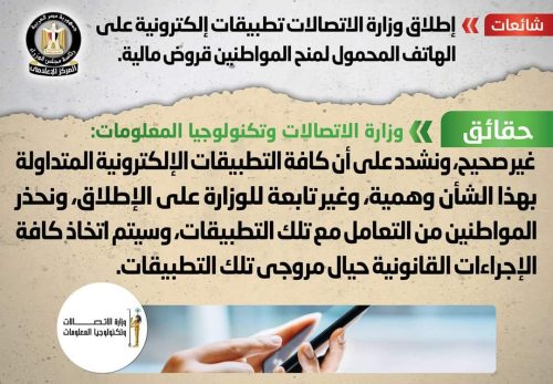 تداولت بعض المواقع الإلكترونية وصفحات التواصل الاجتماعي أنباء بشأن إطلاق وزارة الاتصالات تطبيقات إلكترونية على الهاتف المحمول لمنح المواطنين قروض مالية، وقد قام المركز الإعلامي لمجلس الوزراء بالتواصل مع وزارة الاتصالات وتكنولوجيا المعلومات، والتي نفت تلك الأنباء، مُؤكدةً أنه لا صحة لإطلاق الوزارة أي تطبيقات إلكترونية على الهاتف المحمول لمنح المواطنين قروض مالية، وأن كافة التطبيقات الإلكترونية المتداولة بهذا الشأن وهمية، وغير تابعة للوزارة على الإطلاق، مُحذرةً المواطنين من التعامل مع تلك التطبيقات، وسيتم اتخاذ كافة الإجراءات القانونية حيال مروجي تلك التطبيقات.