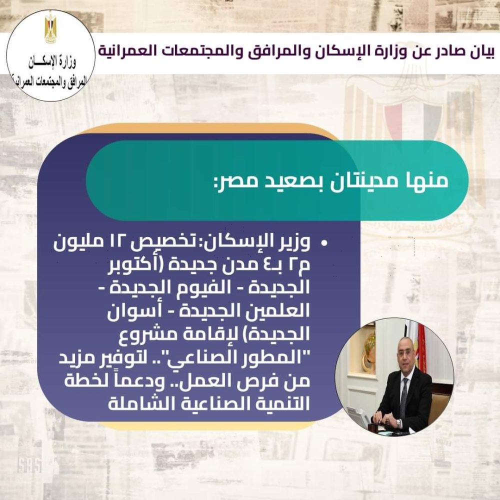 وزير الإسكان: تخصيص 12 مليون م2 بـ4 مدن جديدة لإقامة مشروع “المطور الصناعى” لتوفير فرص العمل