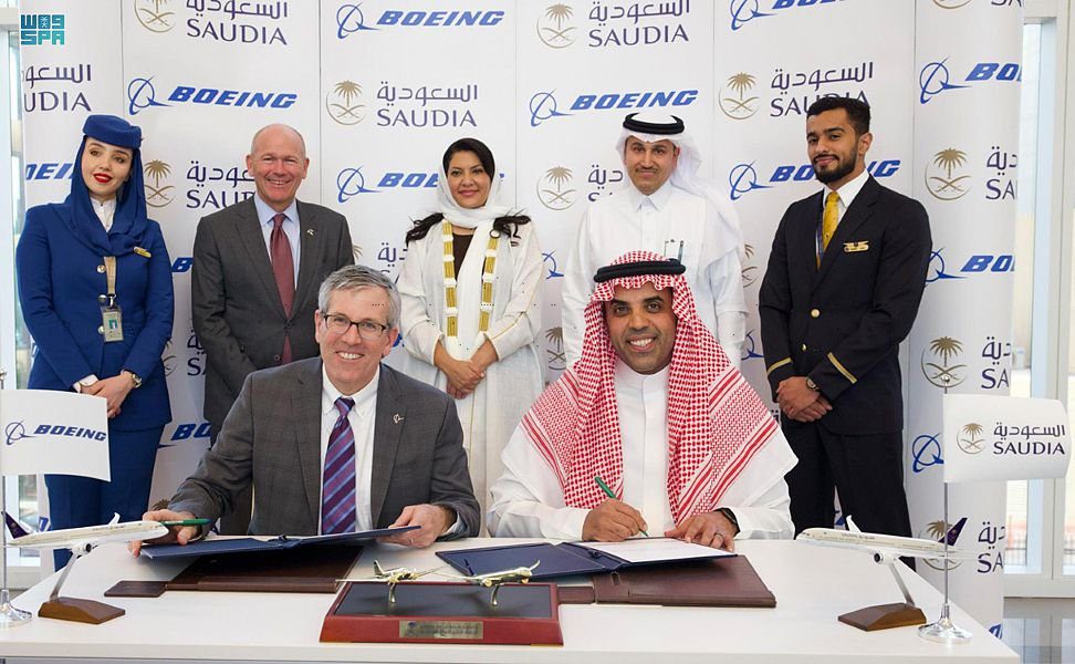 وجرى توقيع الاتفاقية بحضور وزير النقل والخدمات اللوجستية رئيس مجلس إدارة المؤسسة العامة للخطوط الجوية العربية السعودية المهندس صالح بن ناصر الجاسر، وصاحبة السمو الملكي الأميرة ريما بنت بندر بن سلطان؛ سفيرة خادم الحرمين الشريفين لدى الولايات المتحدة الأمريكية، حيث قام بالتوقيع كلٌ من معالي مدير عام المؤسسة العامة للخطوط الجوية العربية السعودية المهندس إبراهيم بن عبدالرحمن العُمر، ونائب الرئيس الأول للمبيعات التجارية والتسويق في بوينج السيد براد مكمولين، و تتضمن الاتفاقية حصول “السعودية” على فئتي طائرة دريملاينر من طراز “B787-9″ و “B787-10″ والتي تتميز بتقليل استخدام الوقود والانبعاثات بنسبة 25%.