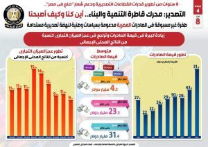 وفي هذا الصدد نشر المركز الإعلامي لمجلس الوزراء تقريراً ضمن سلسلة (أين كنا وكيف أصبحنا) يسلط الضوء من خلال إنفوجرافات على تحقيق الصادرات المصرية طفرة غير مسبوقة مدعومة بسياسات وطنية لنهضة تصديرية مستدامة، وذلك على مدار 8 سنوات من تطوير قدرات القطاعات التصديرية ودعم شعار “صنع في مصر”، باعتبار التصدير محرك قاطرة التنمية والبناء.