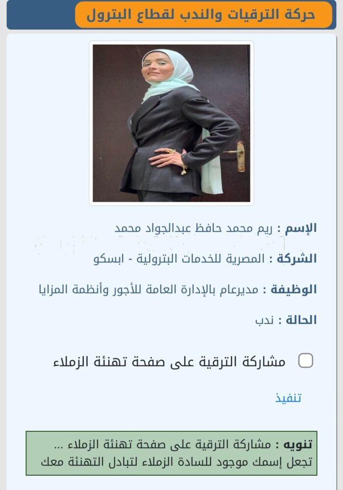 أصدر المهندس طارق المُلا وزير البترول و الثروة، قراراً بترقية ريم محمد حافظ عبد الجواد محمد، إلى درجة مدير عام بالإدارة العامة للأجور وأنظمة المزايا بالشركة المصرية للخدمات البترولية “إبسكو”.