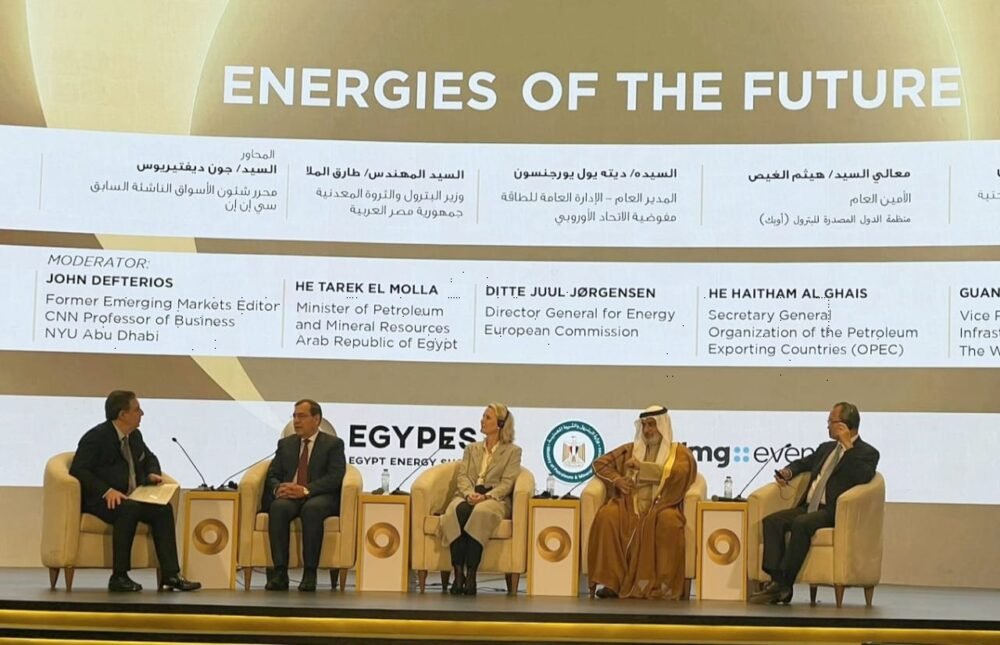 شهد الرئيس عبدالفتاح السيسى خلال افتتاح مؤتمر ومعرض مصر الدولى للطاقة ، جلسة حوارية بعنوان طاقات المستقبل ضمت المهندس طارق الملا وزير البترول والثروة المعدنية وديتى يول يورجنسون مدير إدارة الطاقة بمفوضية الاتحاد الأوروبى وهيثم الغيص أمين عام منظمة أوبك وجوانجزى تشن نائب رئيس البنك الدولى للبنية التحتية.