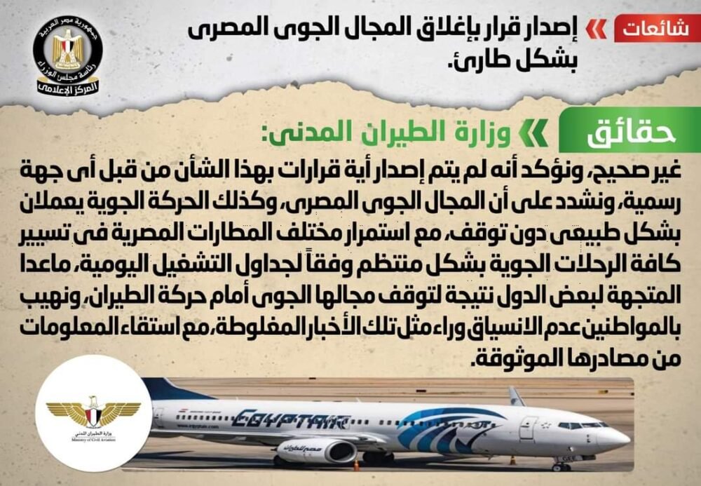 تداولت بعض المواقع الإلكترونية وصفحات التواصل الاجتماعي أنباء بشأن إصدار قرار بإغلاق المجال الجوي المصري بشكل طارئ، وقد قام المركز الإعلامي لمجلس الوزراء بالتواصل مع وزارة الطيران المدني، والتي نفت تلك الأنباء، مؤكدةً أنه لا صحة لإغلاق المجال الجوي المصري بشكل طارئ، وأنه لم يتم إصدار أية قرارات بهذا الشأن من قبل أي جهة رسمية، مشددةً على أن المجال الجوي المصري، وكذلك الحركة الجوية يعملان بشكل طبيعي دون توقف، مع استمرار مختلف المطارات المصرية في تسيير كافة الرحلات الجوية بشكل منتظم وفقاً لجداول التشغيل اليومية، ماعدا المتجهة لبعض الدول نتيجة لتوقف مجالها الجوي أمام حركة الطيران، مهيبةً بالمواطنين عدم الانسياق وراء مثل تلك الأخبار المغلوطة، مع استقاء المعلومات من مصادرها الموثوقة.